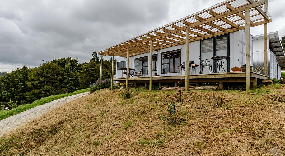 The Container Cottage is a family accommodation unit, built in a 40ft high cube (extra high) shipping container. Insulated, complete with its own bathroom and looking out onto gorgeous views, the Container Cottage is motel style accommodation with a difference. The Container Cottage can sleep up to four and has a large deck to enjoy that indoor/outdoor feeling. The deck is furnished with a table and chairs.